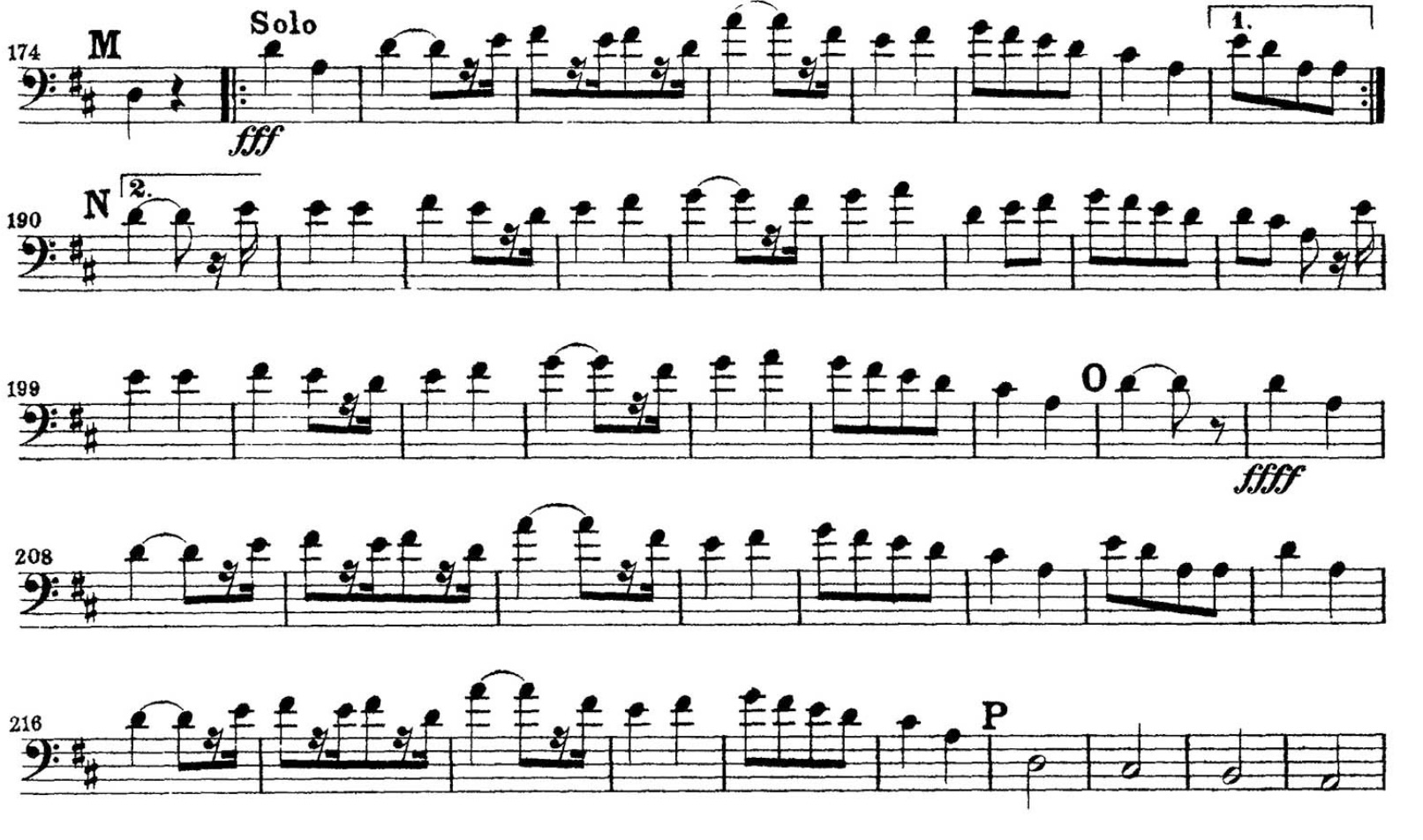 This is one of the most challenging excerpts for bass trombone because of the range it demands. It can be helpful to keep a second, smaller moutpiece with you for this excerpt. This can be especially helpful if you are performing the entire piece. Practice it slowly with meticulous attention to detail in the rhythm, and work the tempo up to the requried BPM from there.