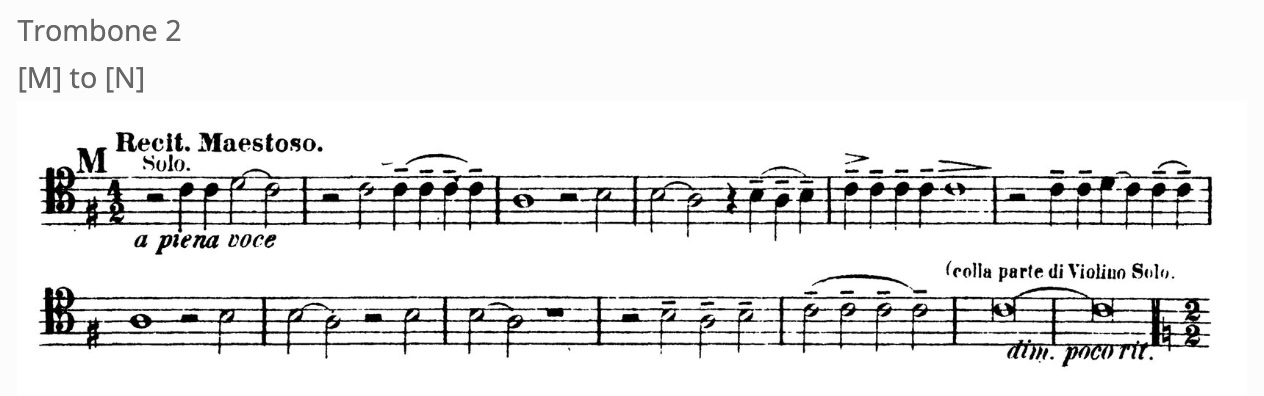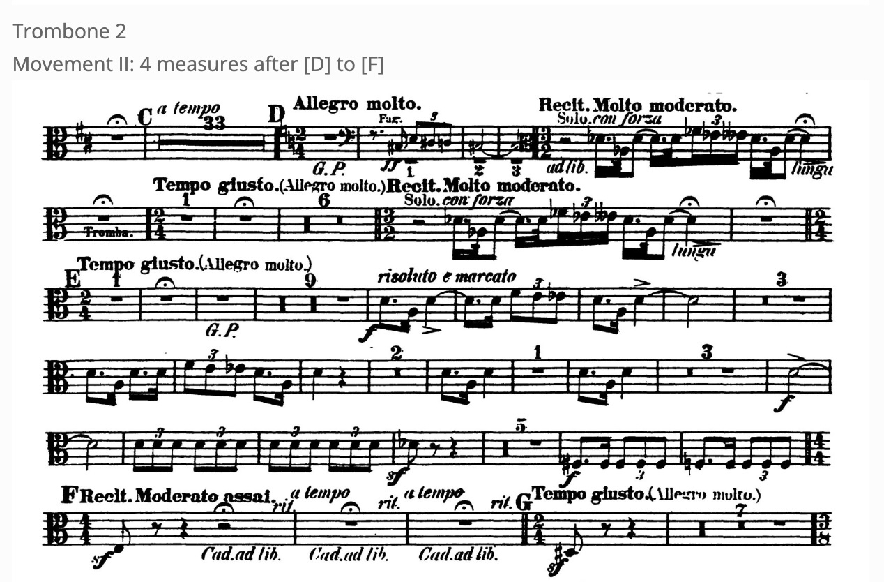This is another famous second trombone excerpt. Make sure to listen to recordings to know how this should sound dynamically and stylistically. Learning how to gain the control to play loudly with a full sound and good tone in an orchestral setting is a process that requires lots of practice.